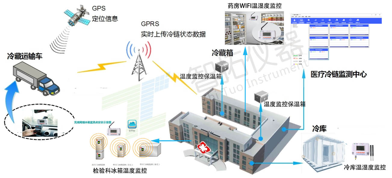 醫(yī)院溫濕度監(jiān)控系統(tǒng)應用背景 醫(yī)院溫濕度監(jiān)測系統(tǒng):可應用于醫(yī)院醫(yī)學實驗室(檢驗科),全國醫(yī)用臨床檢驗實驗室和體外診斷系統(tǒng)標準化技術委員會(SAC/TC136)轉(zhuǎn)化國際ISO標準—醫(yī)學實驗室質(zhì)量和能力認可準則(即ISO15189:2012)對醫(yī)學實驗室的環(huán)境溫濕度和冰箱的溫濕度數(shù)據(jù)監(jiān)控提出了明確的要求。智拓儀器此套系統(tǒng)針對上述要求開發(fā)了醫(yī)院溫濕度監(jiān)測系統(tǒng)來滿足醫(yī)院使用:1.檢驗科冰箱溫度監(jiān)控 2.冷鏈疫苗運輸溫度監(jiān)控3.下屬衛(wèi)生所及科室溫濕度監(jiān)控實現(xiàn)統(tǒng)一集中監(jiān)管監(jiān)控,管理. 如圖-智拓儀器提供整套醫(yī)院溫濕度監(jiān)控系統(tǒng)方案:包括:1.冷藏車溫度監(jiān)控系統(tǒng)2.溫度監(jiān)控保溫箱3.檢驗科冰箱溫度監(jiān)控系統(tǒng)4.藥房WIFI溫濕度監(jiān)控5.冷庫溫濕度監(jiān)控系統(tǒng)6.溫濕度監(jiān)測軟件