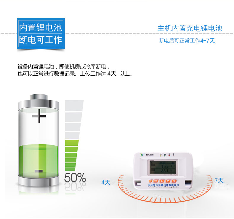 i500系列記錄儀內置有智能芯片,具有12Bit A/D轉換、大屏幕LCD顯示、智能記錄、遠距離通訊功能,采用國際知名品牌的傳感器、微處理器,可實時顯示并自動記錄采集到的溫濕度數據,將其保存在記錄儀內的非易失存儲器中。記錄容量達到2萬組以上,按每半小時記錄一次計算可記錄約一年以上的溫濕度數據資料,這是傳統檢測儀表所不能做到的。